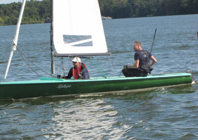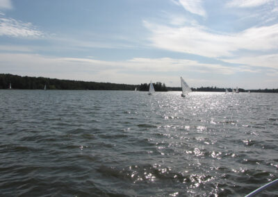 Los ging es dann am Samstagabend um 19:30 Uhr mit der offiziellen Eröffnung und dem ersten Höhepunkt, der Taufe von zwei nagelneuen Optimisten der GSJ und der Namensgebung von 3 weiteren angeschafften, guten gebrauchten Optimisten der GSJ. Nun wurde natürlich auch gesegelt, geübt, gelernt, trainiert was das Zeug herhält. Zu unserer Aller Überraschung zeigte sich unser Segelrevier von der besten Seite mit ausreichend Wind (natürlich total böig wie immer und aus allen Richtungen auch wie immer). Für die Anfänger war unsere „Baabe-Bucht“ direkt vor dem Verein das idealste Einstiegsrevier in den Segelsport, etwas geschützt und direkt vor unseren Steganlagen. Die fortgeschrittenen Optis, die Regattaoptis, die ILKAs und der 420er tummelten sich seit Sonntagvormittag auf dem Zeuthener See, „Seglers Tod“ (Übergang zum Großen Zug) und auf dem Großen Zug. Ein O-Ton einer langjährigen Greifswalder Laser(ILKA)Seglerin „Ich bin fast verzweifelt“. 20°-30° Winddreher, plötzlich einfallende Böen, Kopfböen und Windlöcher waren die Ursache, das die winderprobten Greifswalder ILKAS öfter im Wasser lagen als die Berliner ILKAS (die sonst in Greifswald ständig im Wasser liegen). Fazit, der Plan vor 30 Jahren, Binnenrevier und Küsten / Seebedingungen trainieren ging wieder einmal voll auf. Eine Woche intensives Segeln in allen Altersklassen von Nullanfänger bis Regattasegler hat besonders in dem Anfängerbereich dazu geführt, dass zur Abschussveranstaltung 9 Kindern der bestandene Jugendseglerschein überreicht werden konnte. Das war ein Gänsehautmoment, diese 18 leuchtenden Augen zu sehen. Auch das Rahmenprogramm war für den abendlichen Freizeitbereich prall gefüllt. Badeshow bis zum Abwinken von beiden Kopfstegen, in 2 Luftbällen mit 2m Durchmesser wie Jesus übers Wasser Laufen, auf Surfbrettern von Motorbooten geschleppt Gleichgewichtsübungen, ein Stockbrotabend, ein Kinoabend incl. Popcorn, mit einer unbenutzten Seerettungsinsel, die noch nicht zum Einsatz kam aber ihre Ablaufdatum erreicht hat fand eine Vorführung statt, von der keiner wusste was passiert (zu aller Überraschung hat sie in unserem Innenhafen zu 100% funktioniert), natürlich durfte am Donnerstagabend, die von den Kindern organisierte Trainerregatta nicht fehlen und wie immer zum Leidwesen der Trainer und überschwänglicher Freude der Kinder, und auch für die Greifswalder Helfer, Betreuer und Trainer gab es dann noch auf 2 privaten größeren Motorbooten aus beiden Vereinen der GSJ eine 2-stündige kleine Seenrundfahrt, die allen Beteiligten sehr viel Spaß bereitet hat und die unser umliegendes Revier kennengelernt haben. Der Abschussabend endete dann traditionell mit einem grandiosen Film über eine Woche Trainingslager mit Fotos und Videos über das Erlebte.
