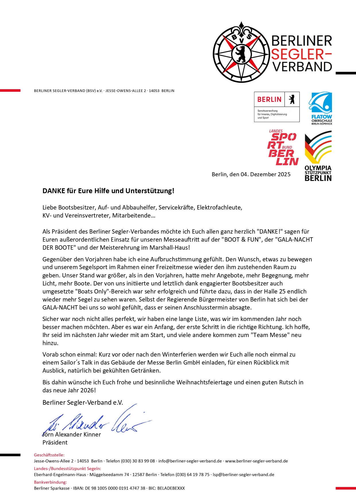 Der Berliner Segler-Verband bedankt sich ganz herzlich bei